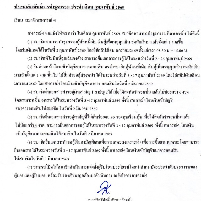 ประชาสัมพันธ์การทำธุระกรรม ประจำเดือน กุมภาพันธ์ 2569