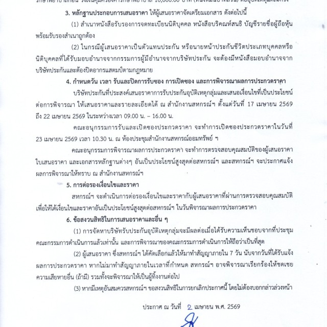 เรื่อง การจัดหาบริษัทรับประกันชีวิตกลุ่มเพื่อคุ้มครองสินเชื่อของสหกรณ์ฯประจำปี 2569
