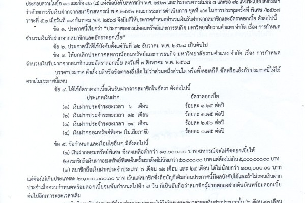 เรื่อง การกำหนดจำนวนเงินรับฝากจากสมาชิกและอัตราดอกเบี้ย